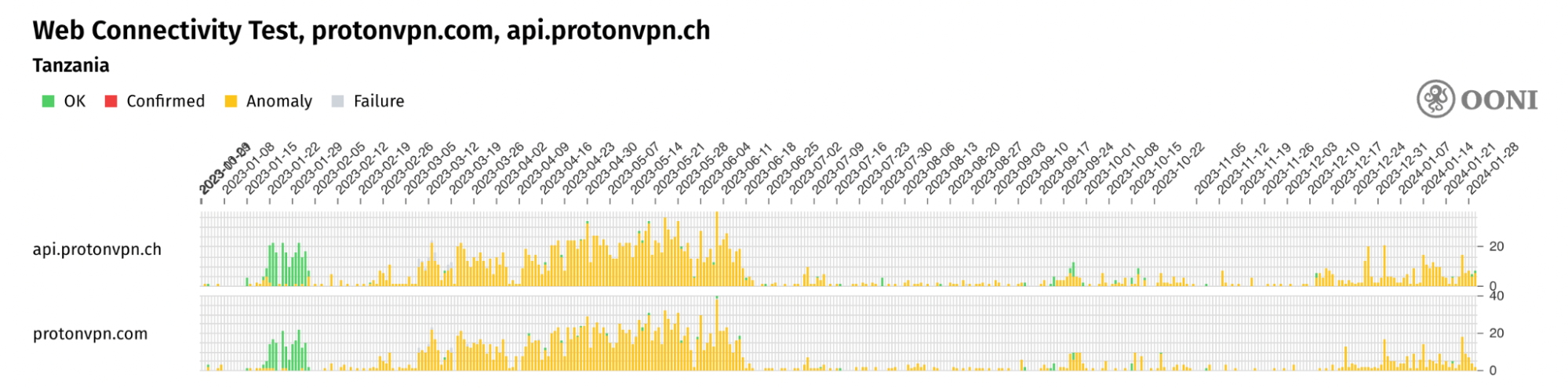 Chart: OONI Probe testing of ProtonVPN (protonvpn.com and api.protonvpn.ch) in Tanzania between 1st January 2023 to 31st January 2024 (source: OONI data).