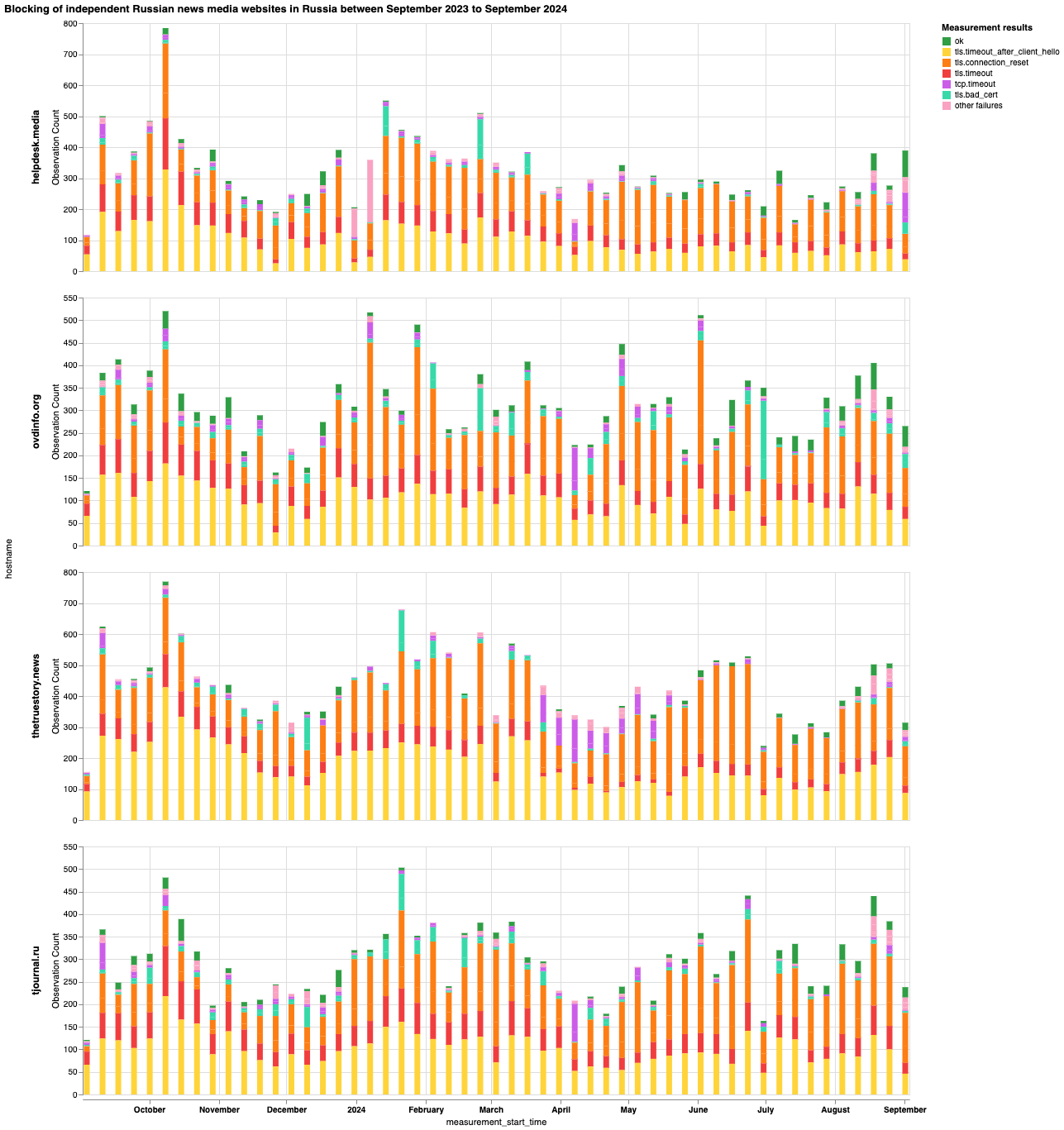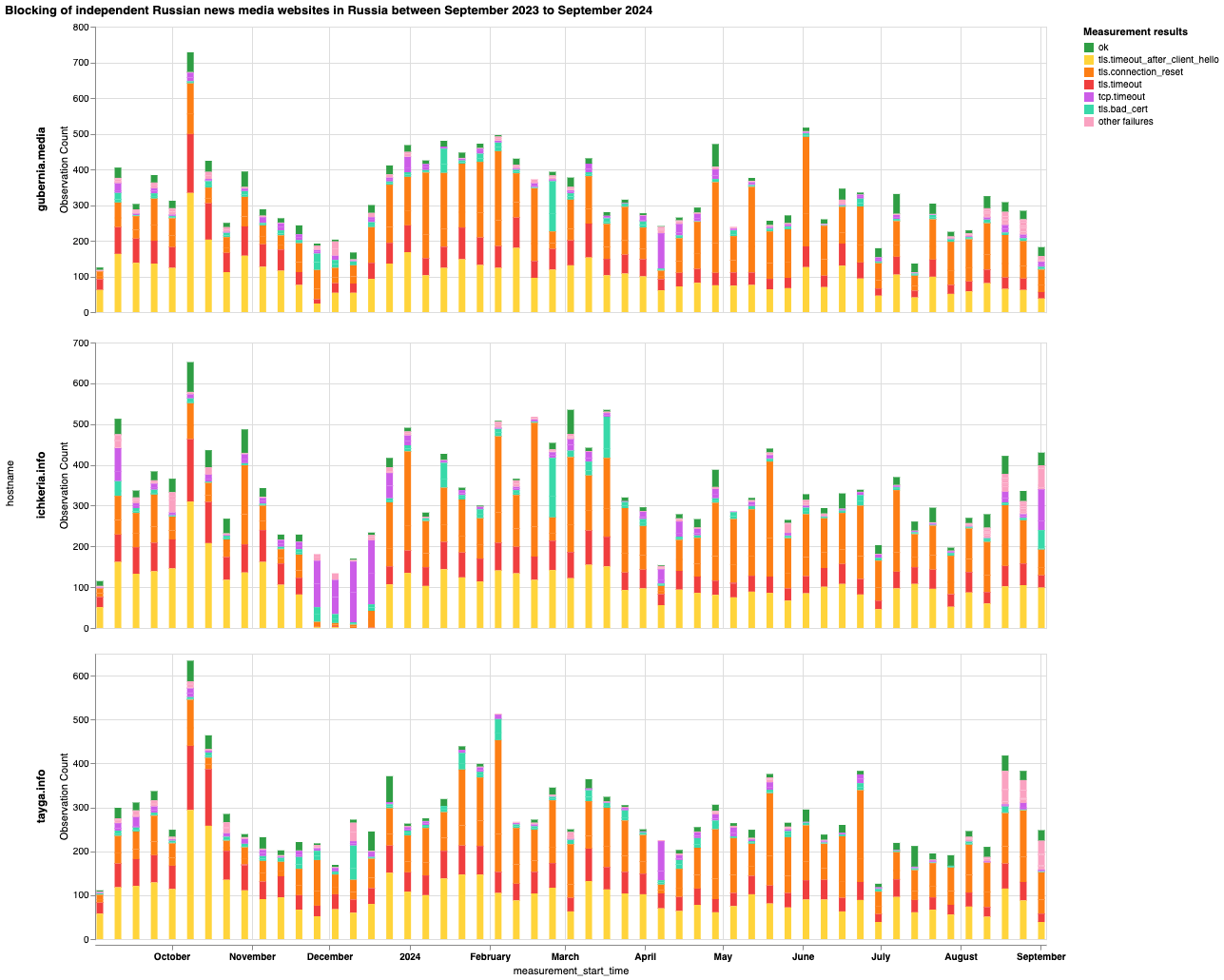В частности, чтобы выяснить, какие сайты независимых российских новостных СМИ блокируются в России и какие методы цензуры применяют интернет-провайдеры, мы проанализировали данные сетевых измерений OONI, собранные в России за последний год (с 1 сентября 2023 года по 1 сентября 2024 года). Чтобы изучить влияние этих блокировок, мы опросили 15 независимых российских новостных СМИ. Мы также проанализировали список сайтов Citizen Lab для России и обновили его, включив в него дополнительные сайты независимых российских новостных СМИ для тестирования OONI Probe. Более подробная информация представлена ниже.
